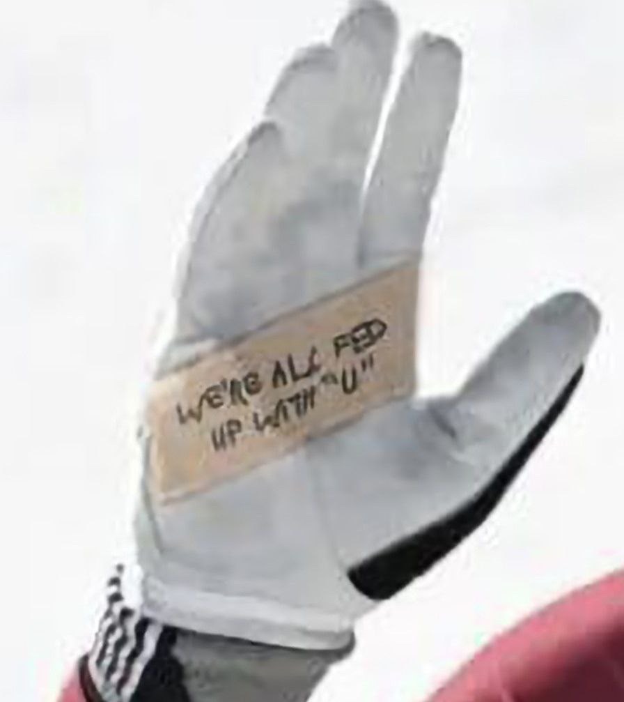 Az “U” egyértelműen Ukrajnára utal, kifejezve a sportoló frusztrációját az ukrajnai konfliktussal kapcsolatos nemzetközi hangulattal szemben.