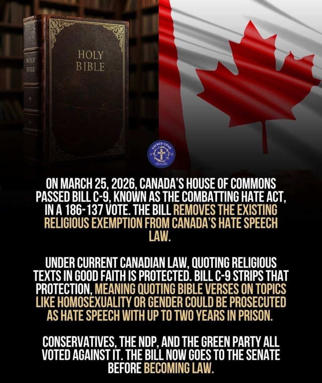 A napokban elfogadtak egy törvényt, amely a Biblia idézését a gyűlöletkeltéssel egyenlőnek jelent ki, tiltja a nyilvános keresztény eseményeket, a Szentírás-olvasást és a „Krisztus elfogadására” való felhívást, sőt akár öt év börtönt is kiszabhat érte. De mi az igazság? Valójában a 2025 szeptemberében benyújtott Bill C-9 (Combatting Hate Act) áll a háttérben, amelyet a kanadai alsóház 2026. március 25-én fogadott el (186-137 arányban), és jelenleg a szenátusban van.