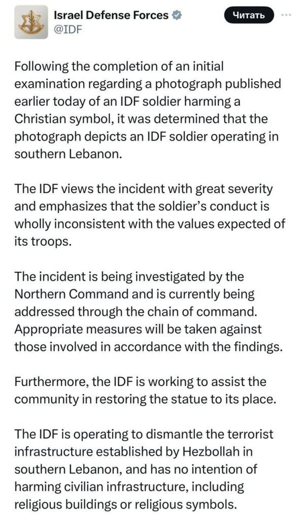 Az IDF hivatalos közleménye szerint a fotón látható incidens után vizsgálatot indítottak, a katona eljárása „teljesen ellentétes a csapatoktól elvárt értékekkel”, és segítik a szobor visszaállítását. Állítják, hogy csak a Hezbollah terror-infrastruktúráját akarják felszámolni, és nincs szándékukban civil vagy vallási célpontokat támadni. Csakhogy a tények – a sorozatos szoborrombolások, kolostor-lövések, templom-lerombolások – és a rabbi nyílt Tóra-alapú igazolása világosan mutatják: ez nem „egy katona túlkapása”, hanem egy mélyebb, vallási-ideológiai gyökerekkel rendelkező minta.